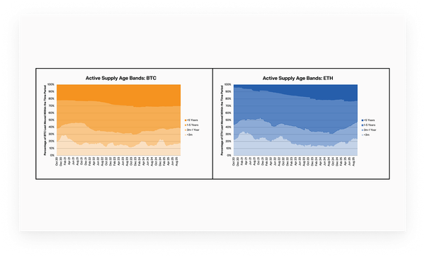 - Dormancy between Bitcoin and Ethereum is diverging: ETH’s long-term holders are mobilising their old coins at a rate that’s 3x faster than BTC’s long-term holders, pointing to utility-driven behaviour.