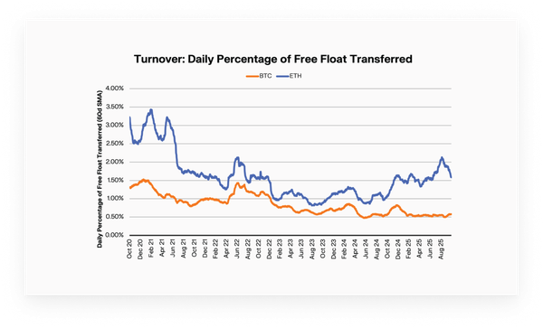 This reduction is paired with the rise of spot ETFs and DATs. Bitcoin ETFs now hold ~6.7% of supply, with DAT structures accounting for ~3.6%. For ETH, ETFs hold ~5.2% and DATs ~4.9%. This shift reallocates supply out of highly liquid venues and into structures with slower mobilisation, narrowing effective float. For Bitcoin, this supports its low-turnover, savings-asset profile. For Ethereum, it complements its role as productive collateral.