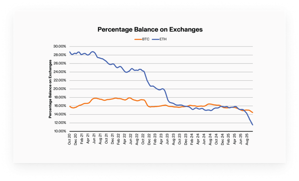 - Exchange balances are falling as institutional wrappers expand: Exchange-held BTC has declined by ~1.5% and ETH nearly 18%, as assets move into ETFs and DATs.