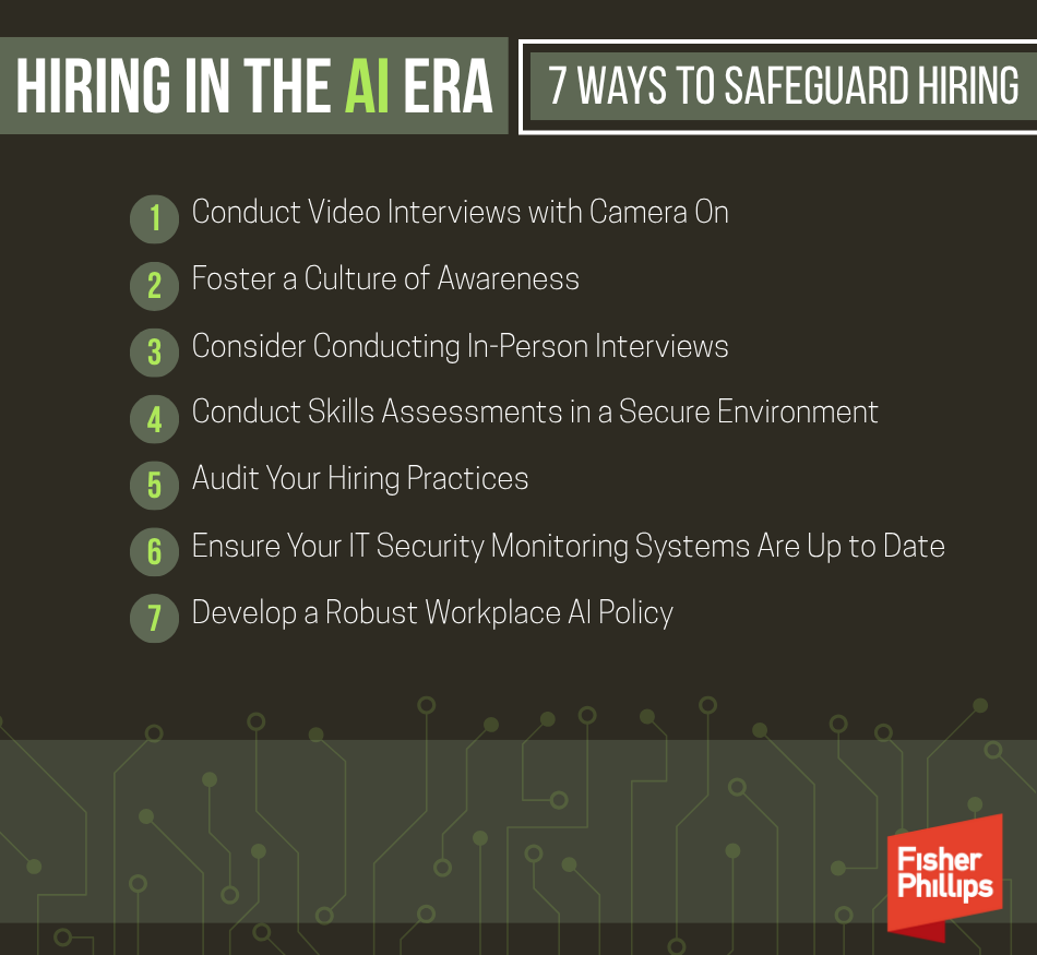 4. Conduct skills assessments in a secure environment. We all use technology in our day-to-day jobs, but you may want to see how candidates perform without these tools. You could arrange for an assessment in a secure environment, such as a testing center or your corporate headquarters. Just be sure to treat all applicants consistently and fairly – and ensure your assessment and screening procedures don’t run afoul of employment laws, such as the Americans with Disabilities Act, Title VII of the Civil Rights Act, state biometric data privacy laws, and wage and hour laws.